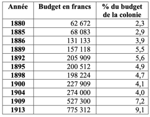Diop (1983) a reconstitué l’évolution du budget de la santé et de la part qu’il tenait dans le budget global de la colonie de 1880 à 1913 (tableau 1). On constate une évolution positive mais avec des montants bruts faibles qui s’accroissent à la fin de la période, notamment à cause des besoins de lutte contre les épidémies. En effet, « les dépenses des hôpitaux ne cessent de diminuer… Ceci répond aux besoins d’une nouvelle politique caractérisée par une médecine prophylactique et collective » (Diop, 1983 : 158). Après 1904, l’augmentation s’explique certainement par le nouveau besoin créé par les dépenses pour faire fonctionner l’Assistance médicale indigène et d’Hygiène (Gouvernement général de l’Afrique occidentale française, 1931), que j’analyse en détail plus loin dans la troisième partie. Plus de un million de francs seront octroyés en 1914 pour lutter contre la peste (Becker et al., 2008). Cependant, le Gouverneur général de l’AOF William Ponty est embarrassé, car le Trésor ne dispose alors pas de suffisamment de fonds pour payer les indemnités promises aux Lébous pour la destruction de leurs maisons dans le cadre des actions de lutte contre la maladie (Echenberg, 2002).
