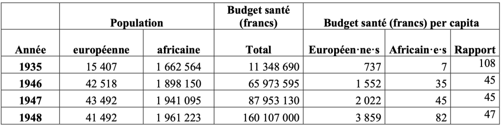 À partir des données populationnelles présentées dans le rapport annuel de 1948, on peut tenter une comparaison des budgets accordés à la santé, per capita, entre population européenne et africaine (tableau 3). Comme on ne connaît pas la répartition de ce budget selon les structures fréquentées par ces personnes, restons sur une division simple entre le budget et la population. Il est probable que les données de ce tableau sous-estiment la part des budgets consacrés aux hôpitaux, qui sont bien plus importants que ceux pour l’AMI. Mais leurs différences abyssales donnent une idée de l’allocation des ressources per capita selon les deux grands groupes de population, confirmant l’orientation budgétaire en faveur de la population européenne (surtout française) au détriment des populations africaines. Bien que cette analyse ne tienne pas compte de l’inflation entre 1935 et 1948, les populations africaines reçoivent entre 45 et 108 fois moins d’allocation budgétaire que les populations européennes, alors même que les besoins des premières sont certainement beaucoup plus importants.