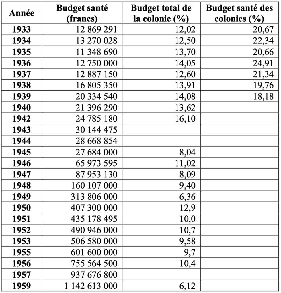 Les différents budgets locaux ont prévu de la manière la plus large le fonctionnement des services sanitaires et les crédits qui s’y rapportent représentent, selon les colonies, de 7 à 11% des ressources totales. À mesure que l’Assistance se développera et que son personnel augmentera, d’autres dépenses seront à prévoir; il n’est pas douteux que les colonies sont prêtes à faire tous les sacrifices nécessaires, toutefois le développement économique ne saurait en être compromis et, pour ce motif, il est prudent de considérer la proportion de 12% comme un maximum que les crédits des services sanitaires ne pourront dépasser. (Gouvernement du Sénégal, 1931)