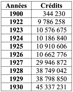Le rapport annuel de 1933 de l’Inspection générale de la santé pour l’AOF indique que les crédits affectés pour l’AMI en 1927 étaient de 26 millions de francs, soit beaucoup plus que les 10 millions de 1926 et les 344 230 francs de 1900. Le rapport concernant l’AOF rédigé pour l’exposition universelle de 1931 propose des chiffres un peu différents mais laissant croire à une hausse importante en 1927 après plusieurs années de stagnation (tableau 18).