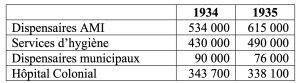 Dans le rapport annuel de 1940, les dépenses affichées pour l’AMI ne concernent que le matériel, pour un montant total de 5,2 millions de francs, soit 24,8% de l’ensemble des dépenses de santé de la Colonie.