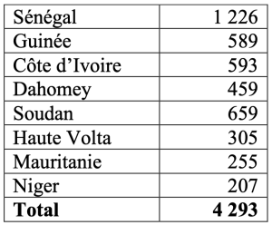 Dans un tableau qui semble dater de 1923, la liste de quatre sociétés de secours mutuels de la Guinée, approuvées par l’administration est présentée. Toutes situées à Conakry, elles disposent de seulement 151 membres adhérent·e·s à elles quatre. On y retrouve l’« Association amicale et professionnelle des agents du chemin de fer de Conakry au Niger », la « Société de secours mutuels des Hauts Guinéens et Soudanais », la « Société générale de secours mutuels indigènes de la Guinée française » et enfin la « Société sénégalais » (sic), preuve qu’il existe des regroupements fondés sur « l’origine ethnique », comme indiqué précédemment. La Haute-Volta disposerait à cette époque de plusieurs mutuelles scolaires, mais seule la « Mutualité familiale du Sénégal » est mentionnée pour l’AOF lors de l’exposition coloniale nationale de Marseille (Heller, 1922).